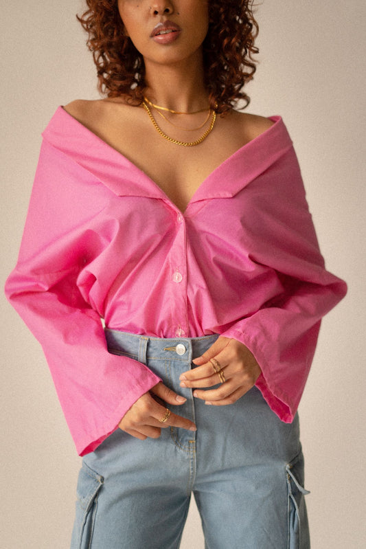Introducing our versatile Lana Oversize* Off-Shoulder Top - a perfect wardrobe staple for all four seasons. This chic top features button-front closures, a curved hem, and a relaxed silhouette, making it the ultimate fashion statement.